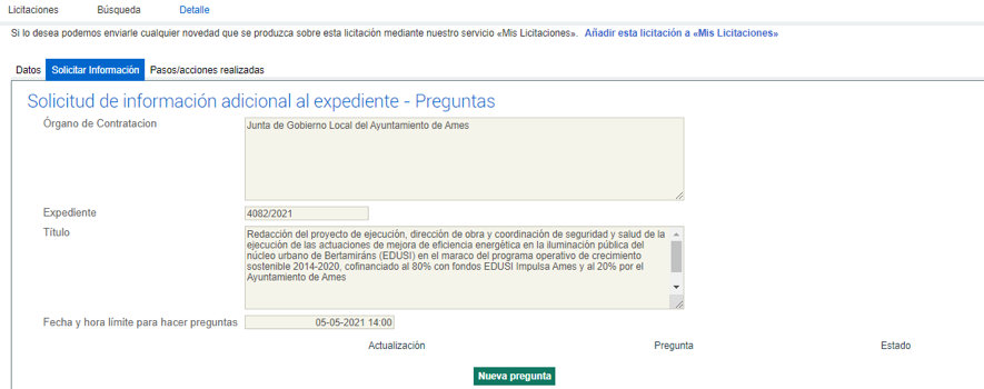 - Una vez dentro de la propia licitación en la parte superior podremos encontrar un apartado tal que: “Solicitar Información”.